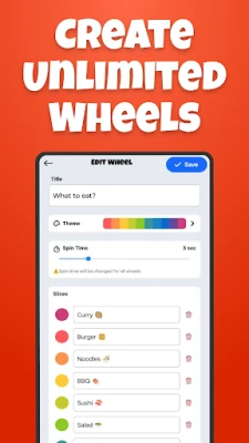 Men reisen stopper ikke der. Denne appen inviterer deg til å skape din helt personlige opplevelse. Med et rikt utvalg av livlige farger, fengende etiketter og iøynefallende temaer, har du friheten til å designe hjul som speiler din stil og dine behov. Lagre dine spesialtilpassede oppsett for rask og enkel tilgang, enten det er for personlige dilemmaer, profesjonelle avgjørelser, eller lek og læring. Du kan også dele dine unike kreasjoner og resultater med venner og familie for felles moro eller verdifull innsikt.