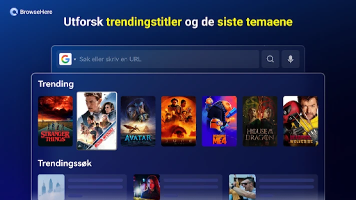 Utforsk et univers av underholdning med BrowseHeres kurerte utvalg av gratis filmer og animasjon, tilgjengelig rett fra startskjermen. Hold deg oppdatert med hva som rører seg i verden gjennom de siste trendene og populære søk, som gir deg en ufiltrert oversikt over toppnyheter. For å gjøre navigeringen enda mer effektiv, kan du enkelt bokmerke favorittnettstedene dine og få rask tilgang til dem via historikkfunksjonen – alt mens BrowseHere respekterer ditt personvern og ikke samler inn brukerdata. Få også skreddersydde innholdsanbefalinger som passer din smak, og gjør valget av filmer og serier enklere enn noensinne. Du kan til og med sende URL-er fra mobilen til TV-en din med en QR-kode, for enkel tilkobling. BrowseHere er kompatibel med et bredt spekter av TV-er og strømmeenheter, slik at du kan nyte alle disse funksjonene uansett hvilket utstyr du har.