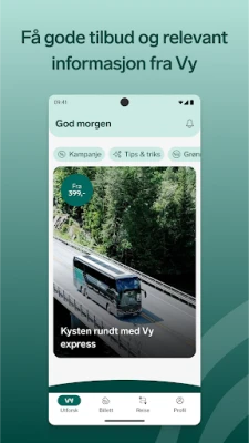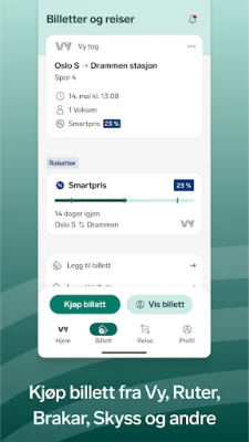 Med Vy-appen planlegger du enkelt reiser med tog, buss, t-bane, trikk og båt over hele Norge. Finn avganger og kjøp billetter fra Vy og selskaper som Ruter og Kolumbus. Vy-appen gjør det lett å reise miljøvennlig og enkelt fra A til B.