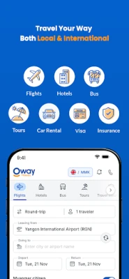 Planlegg din drømmereise med Oway. Utforsk Myanmar og verden, og spar stort på flybilletter, hoteller og komplette turpakker. Appen er tilgjengelig på burmesisk og engelsk, og aksepterer USD og MMK for en sømløs reiseopplevelse.