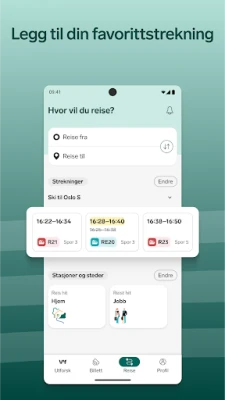 Optimaliser din reiseopplevelse ytterligere ved å enkelt lagre dine foretrukne strekninger og ofte besøkte steder. Få rask tilgang til relevant informasjon og spar verdifull tid på daglige turer. Trenger du transport der kollektivtilbudet ikke strekker til? Appen gir deg også muligheten til å bestille taxi i et bredt utvalg av byer og regioner over hele landet, alt samlet på ett sted. Og for å gjøre reisetiden enda mer behagelig og produktiv, får du tilgang til et rikholdig utvalg av underholdning: Lytt til spennende lydbøker og populære podkaster, eller les ferske aviser og magasiner direkte i appen. Vi tror at hver eneste reise skal være like berikende som destinasjonen.